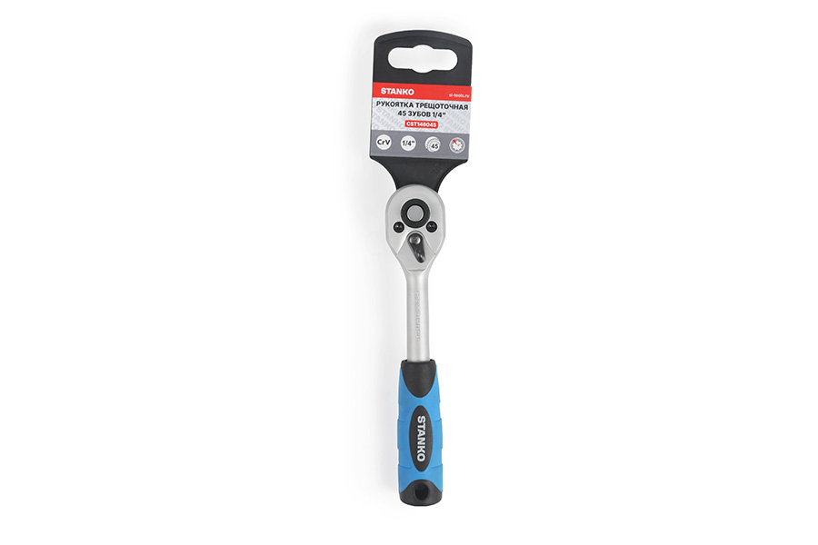 Трещотка изготовлена из высококачественной легированной хромованадиевой инструментальной стали, с последующей закалкой до твердости в пределах 46-48HRC, что обеспечивает оптимальное соотношение прочности и твердости. Эргономичная рукоять обеспечивает надежное удержание инструмента и комфортную работу, а благодаря высококачественным компонентам рукоять обладает высокой стойкостью к агрессивным средам.